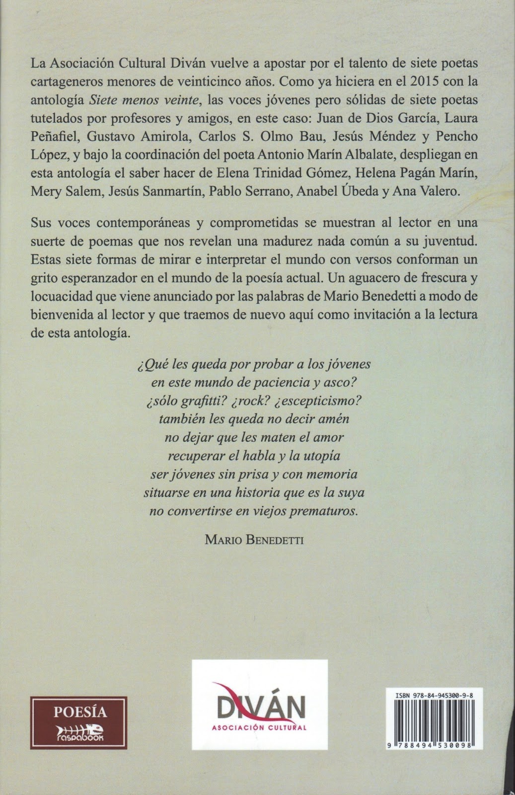 La Asociación Cultural Diván vuelve a apostar por el talento de siete poetas cartageneros menores de veinticinco años , como ya hiciera en 2015 con la Antología “Siete menos veinte”.